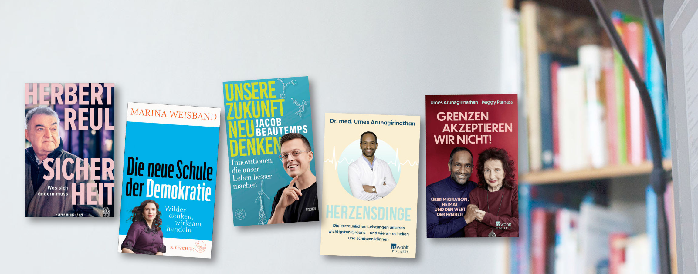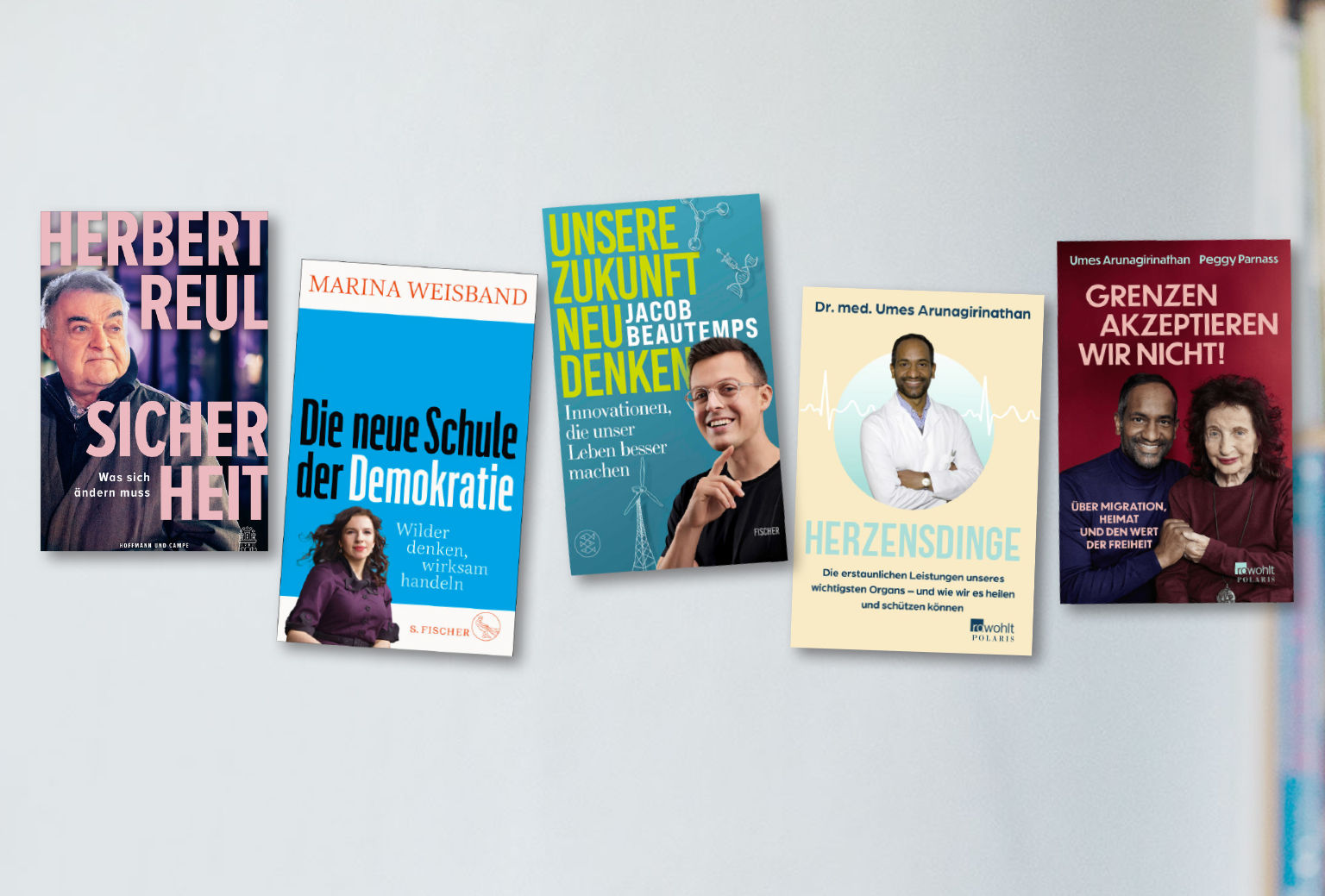 Zwei Neuerscheinungen sind eher wissenschaftlich orientiert: „Unsere Zukunft neu denken“ für Jacob Beautemps sowie „Herzensdinge“ für Umes Arunagirinathan. Ganz anders gelagert ist „Grenzen akzeptieren wir nicht!“. Es handelt sich um das zeitgeschichtliche und autobiografische Dokument zweier Persönlichkeiten, die je auf ihre Weise Deutschland besonders verbunden sind: Umes Arunagirinathan und Peggy Parnass.